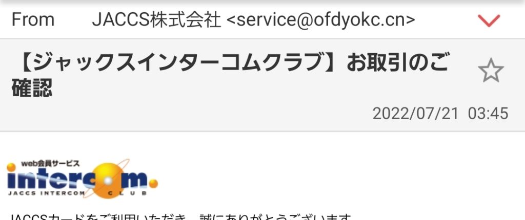 送信元のメールアドレスをチェックをすると迷惑メールであるかどうかわかる場合が多いです。この場合だと「service@ofdyokc.cn」がメールアドレスになります。注目するのは@以降の文字列です。普通は.co.jpや.comがついている場合が多いですがこのメールアドレスの場合は.cnになっています。.この時点でジャックスが送信してきたメールではない可能性が高くなります。ちなみにcnは中国のドメインとなります。(.co.jpドメインは日本の会社しか取得することができないため信頼性は非常に高くなります。)