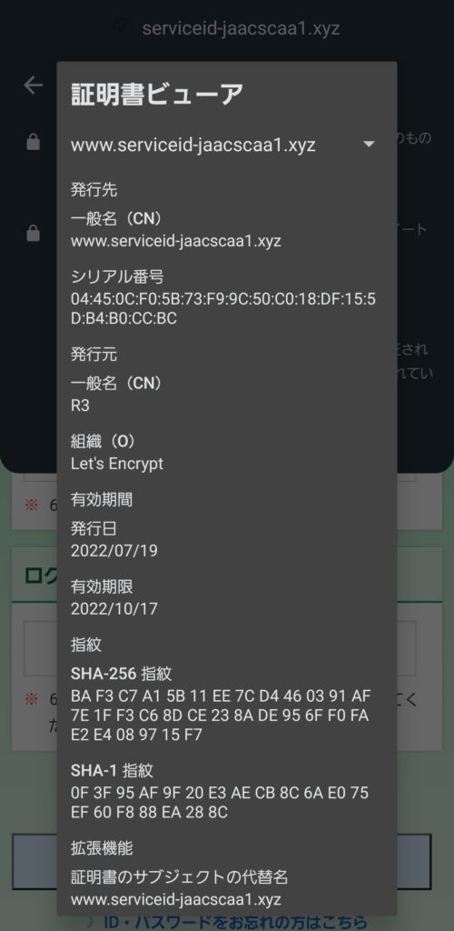 組織名がLet’s Encryptであることがわかります。Let’s Encryptは外に漏れないようにするための暗号化通信に必要な証明書を無料で発行している非営利団体です。一般的な企業などは使用することはほぼありません。もしLet’s Encryptだった場合は少し疑ってみた方が良いでしょう。